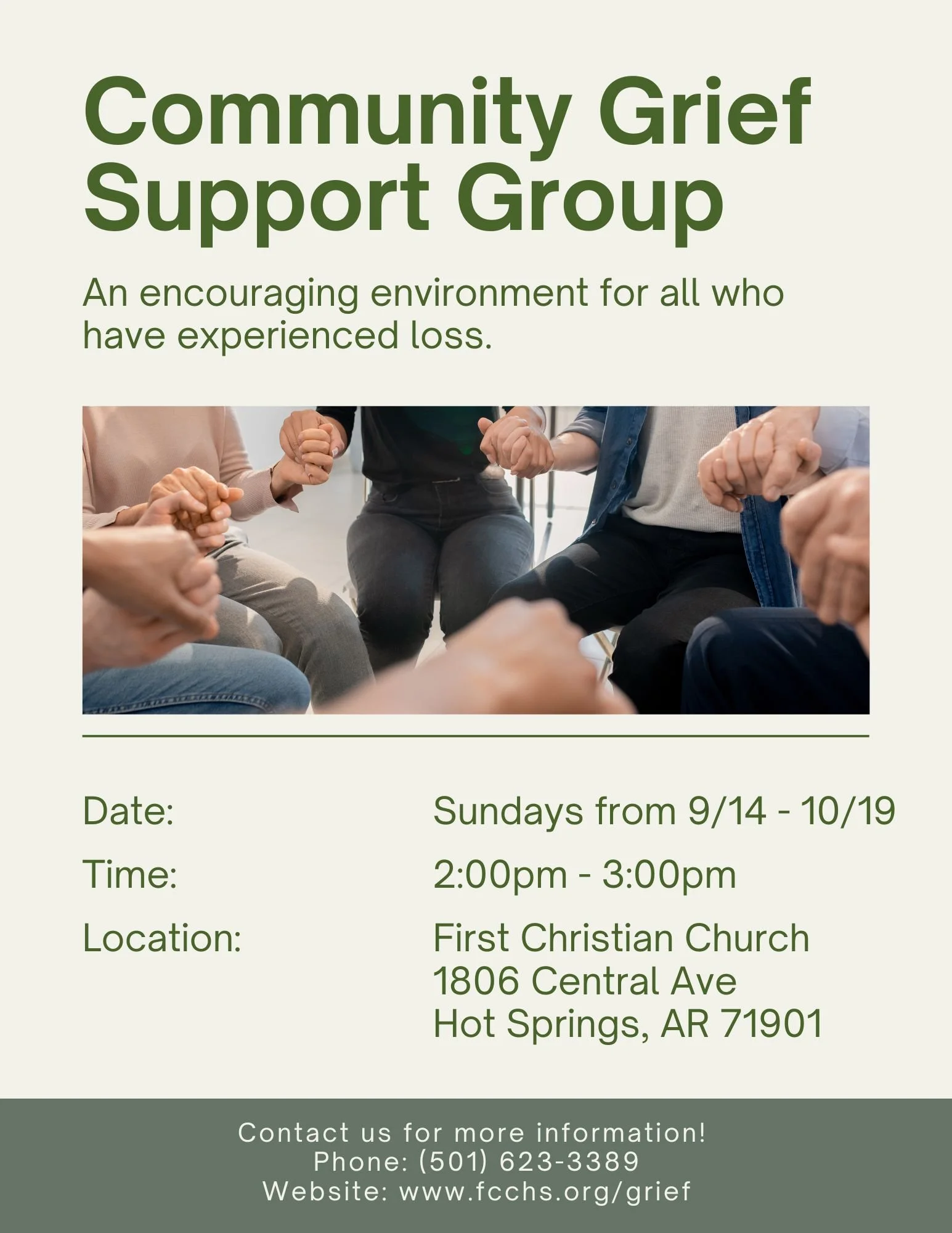This fall First Christian Church will be hosting a six-week support group for any and all in our community who are experiencing loss. You need not be a member of our church (or any church) to join - we want this group to be a safe space for people of all backgrounds and beliefs.